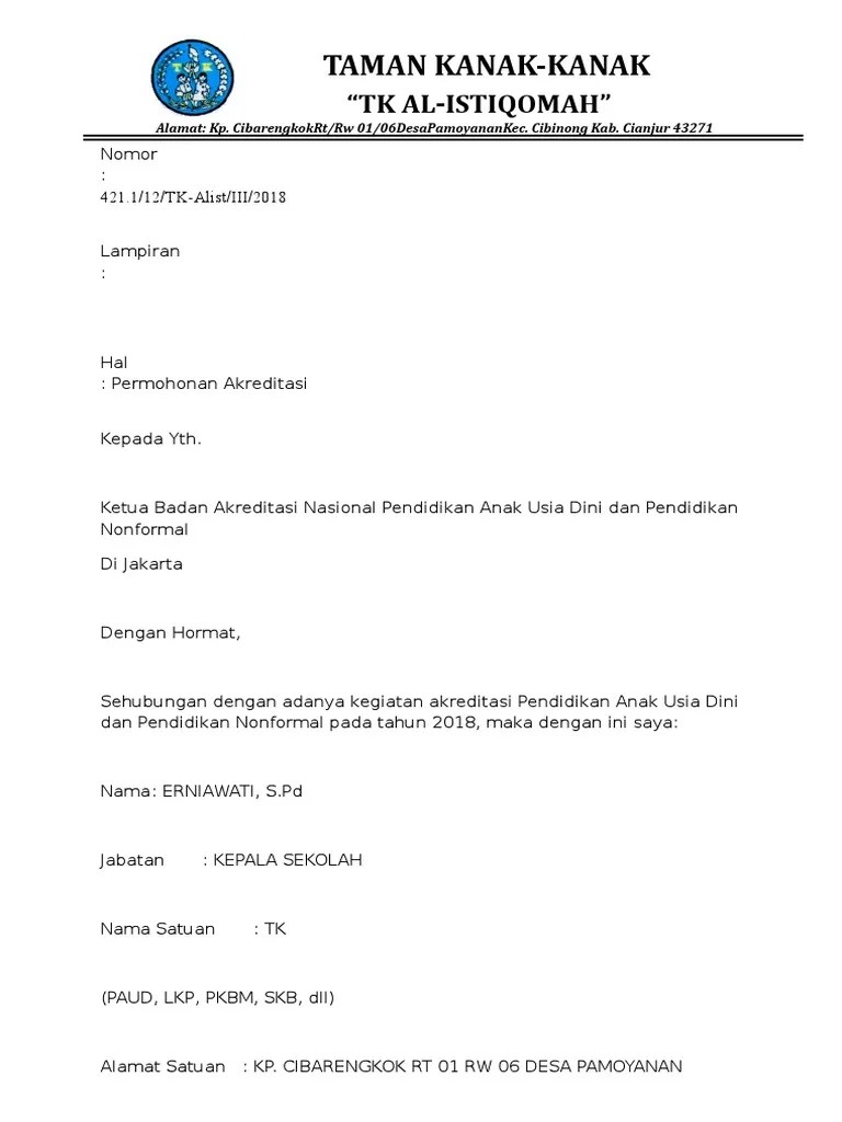 Contoh surat permohonan akreditasi sekolah contoh format surat permohonan pengajuan akreditasi paud dan pnf dan cara upload surat permohonan . (nama jelas dan stempel satuan). Surat permohonan akreditasi paud berfungsi untuk mengajukan akreditasi pada satuan pendidikan paud/tk. Kop surat lembaga paud dan pnf. Surat permohonan akreditasi sekolah dasar. Kepala dinas pendidikan kabupaten indramayu Surat permohonan sendiri terdiri atas beberapa kategori yaitu surat permohonan rekomendasi surat permohonan izin . 22) surat permohonan akreditasi asosiasi asosiasi terkait rantai pasok. Pdf dan sudah diberikan tanda tangan. Surat ini nantinnya di upload pada sispena ban paud . Sebagaimana diketahui permohonan pengajuan akreditasi paud dan pnf saat ini dilakukan secara online melalui aplikasi sispena ban puad pnf yakni .