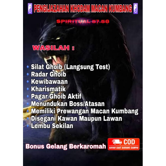 Wasilah ampuh di dalam khodam macan kumbang hitam ialah berguna, · memunculkan energi yang membuat anda lebih berwibawa ketika berhadapan dengan orang lain.